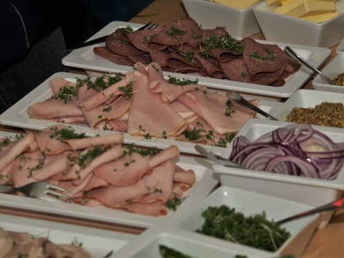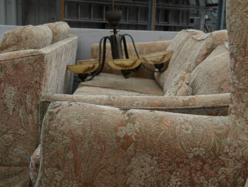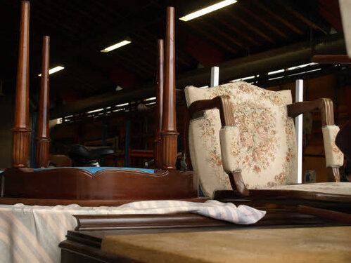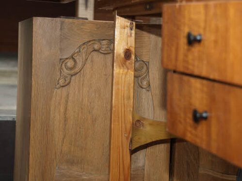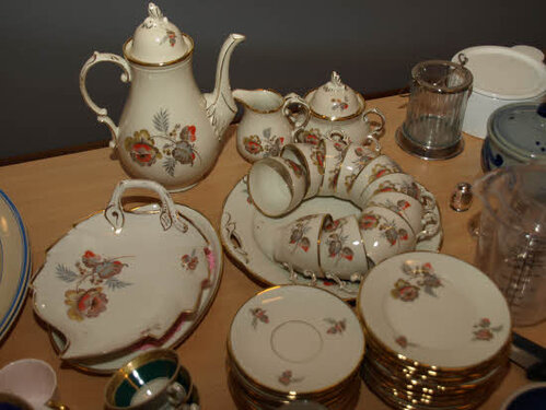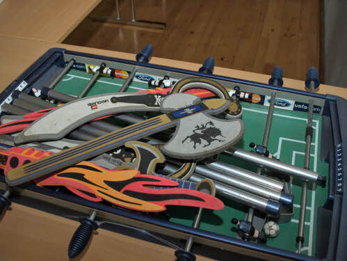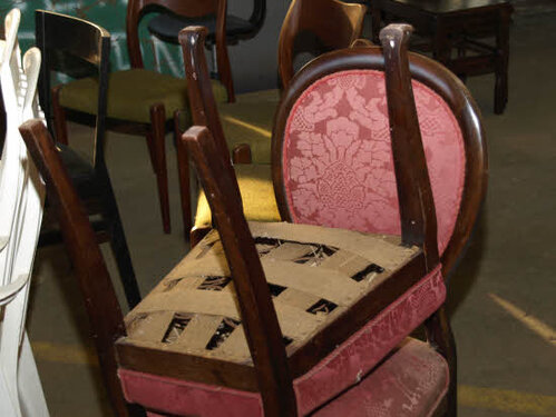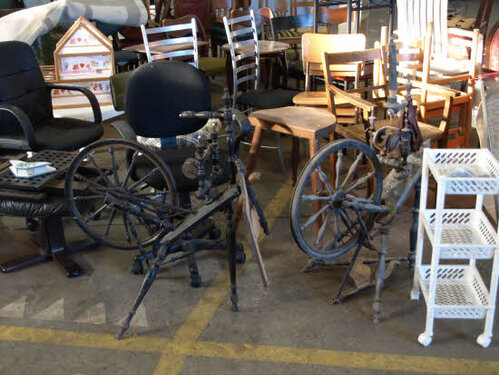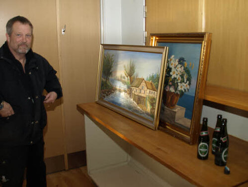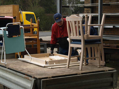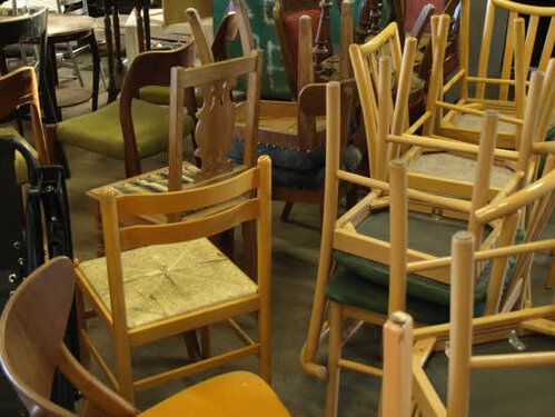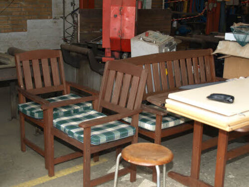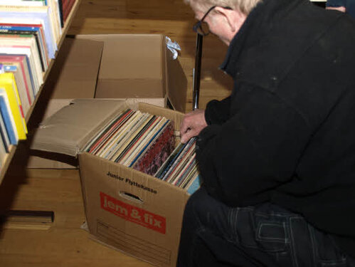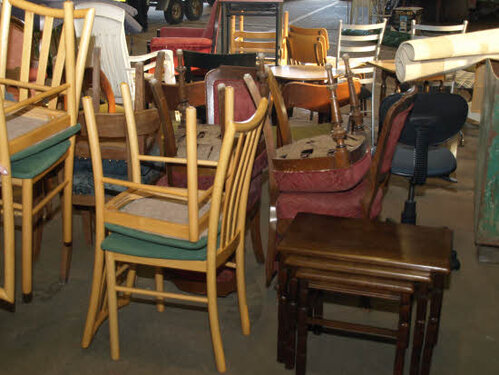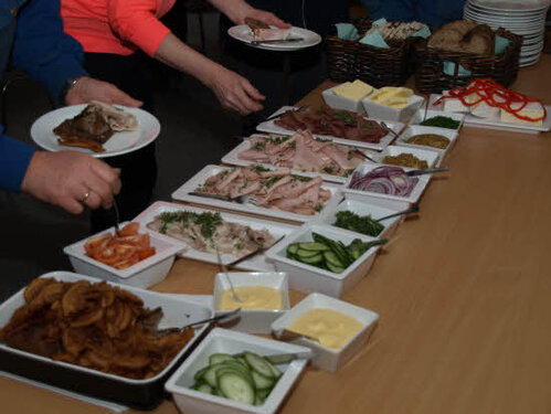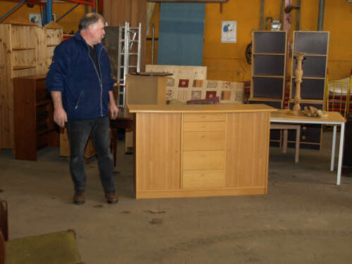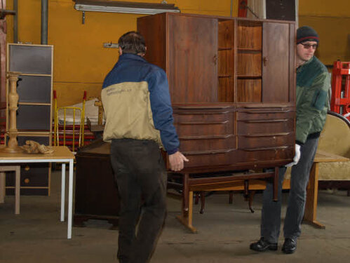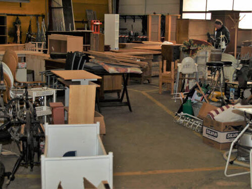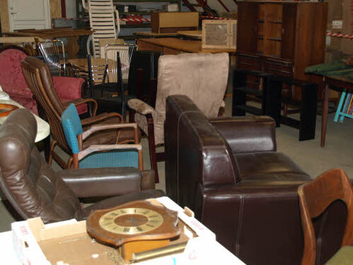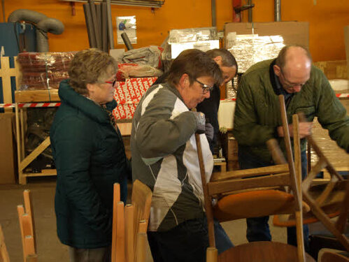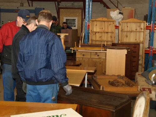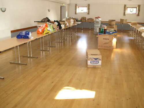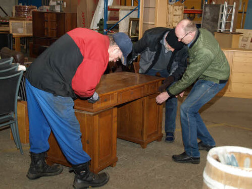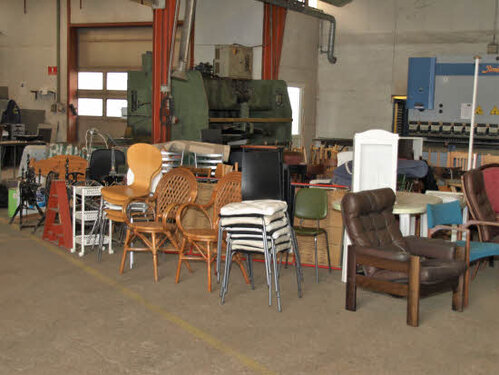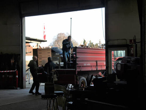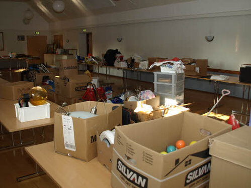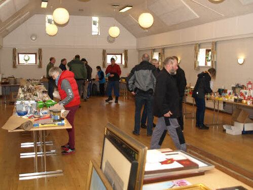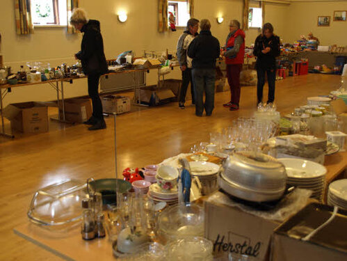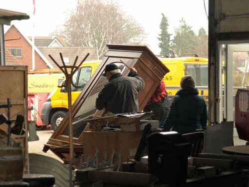 Lørdag kom bestyrelsen og frivillige og stillede op på bordene i forsamlings-huset, og en masse møbler blev sat frem i smedens hal.