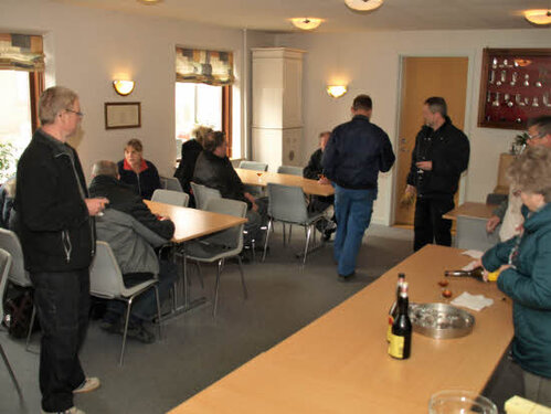 Informationsmøde med en dram, inden dagens arbejde begynder.