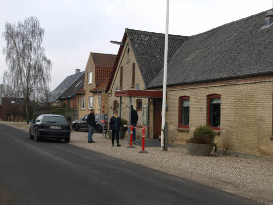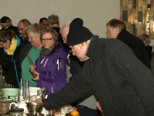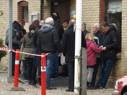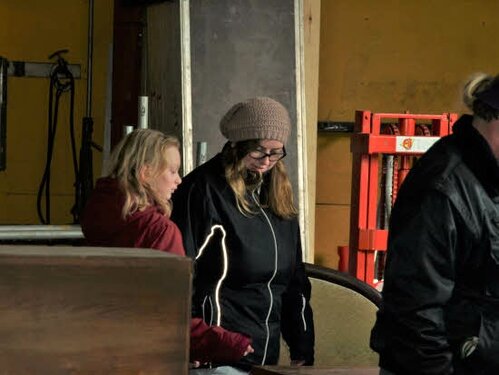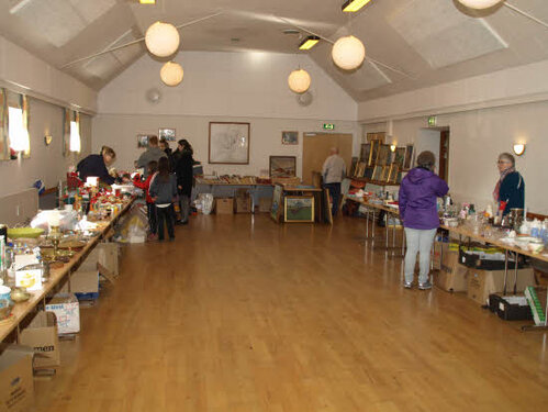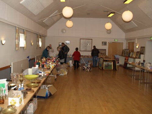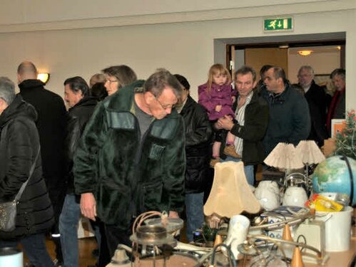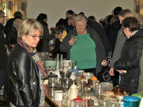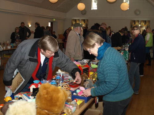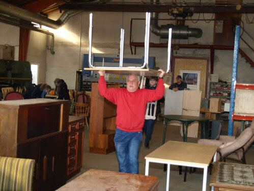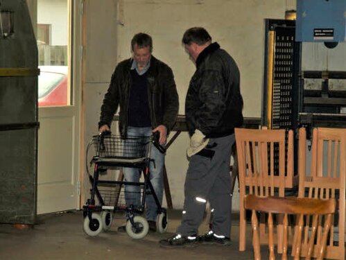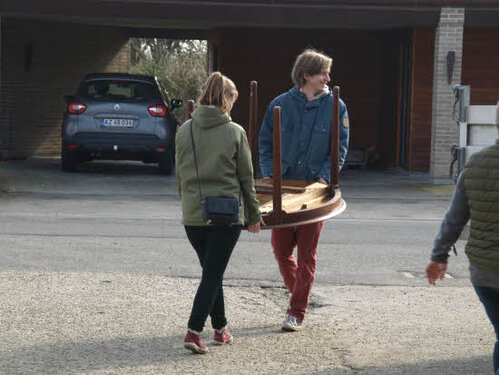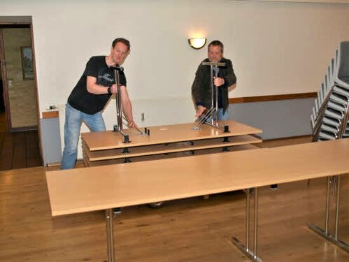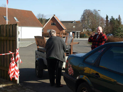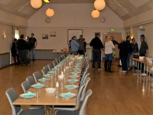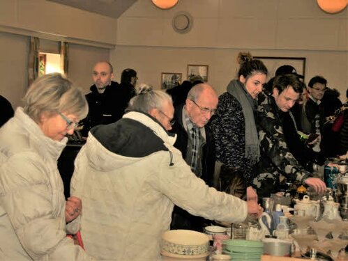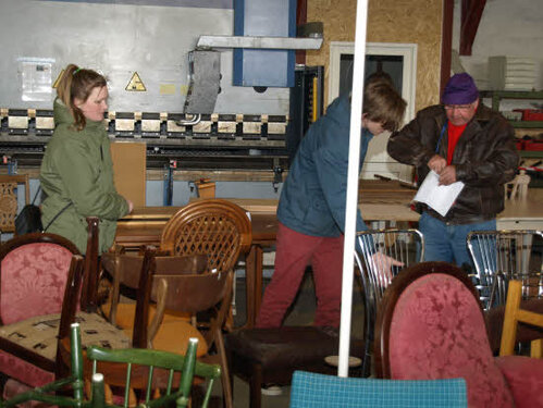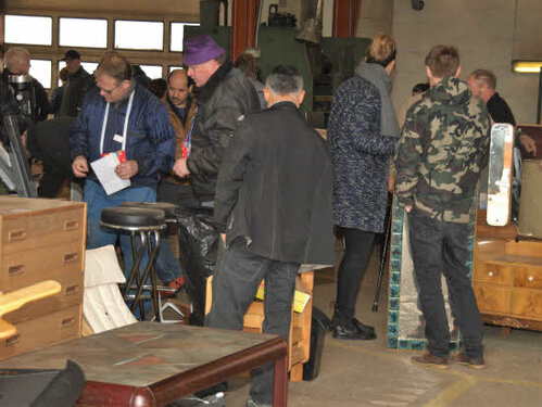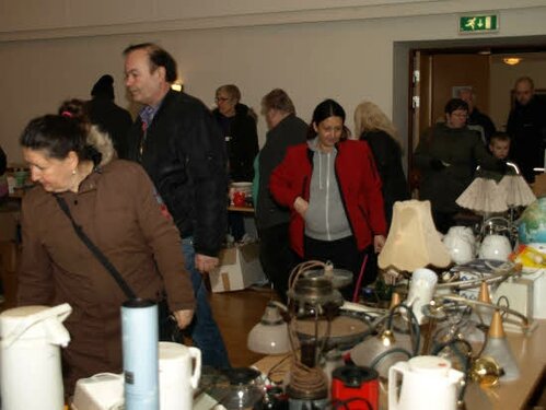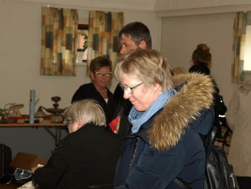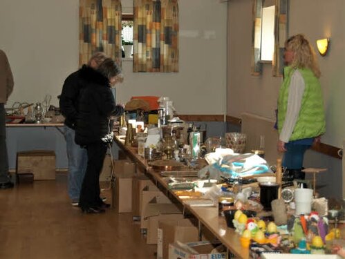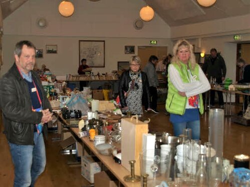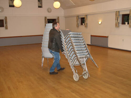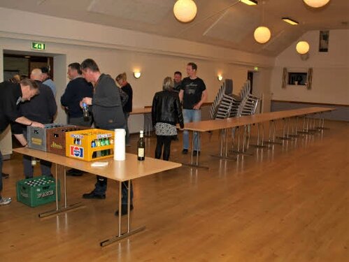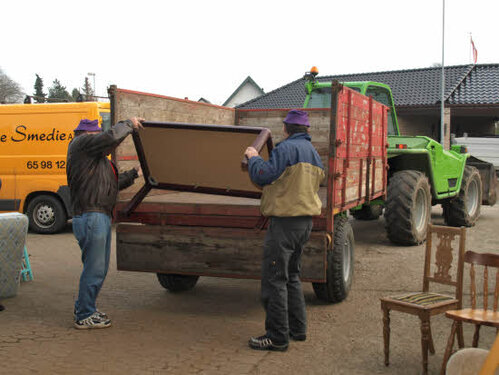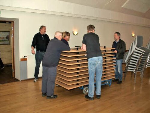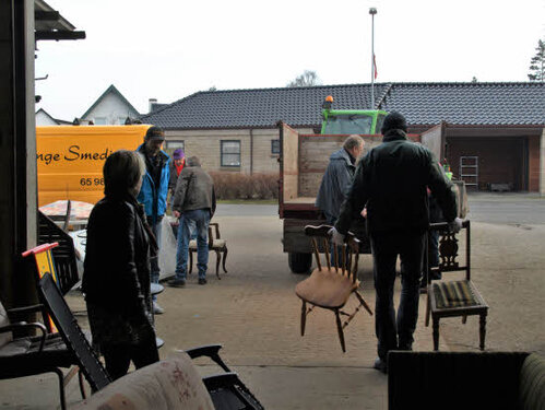 Lørdag kom bestyrelsen og frivillige og stillede op på bordene i forsamlings-huset, og en masse møbler blev sat frem i smedens hal.
